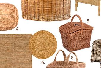 1. Banderines de yute 2. Lámpara de techo de mimbre 3. Sillón de mimbre 4. Puff de yute 5. Cesta de picnic de mimbre 6. Salvamanteles de yute 7. Alfombra de yute 8. Cesta de cáñamo 9. Lámpara de mesa de mimbre
