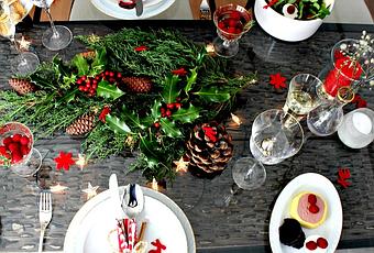 Como centro y camino de mesa ha realizado una vistosa composición a base de abeto, acebo, piñas y renos de fieltro rojo, que también ha sido iluminado gracias a la guirnalda dispuesta en la mesa. Las velas rojas y blancas colocadas en botellas, frascos y portavelas crean un ambiente muy romántico y acogedor. Ha apostado por una vajilla sencilla en color blanco con discretos detalles en tono dorado, una básico que se integra perfectamente en la mesa, y la cristalería es muy elegante con el filo en dorado en armonía con el motivo de los platos utilizados.