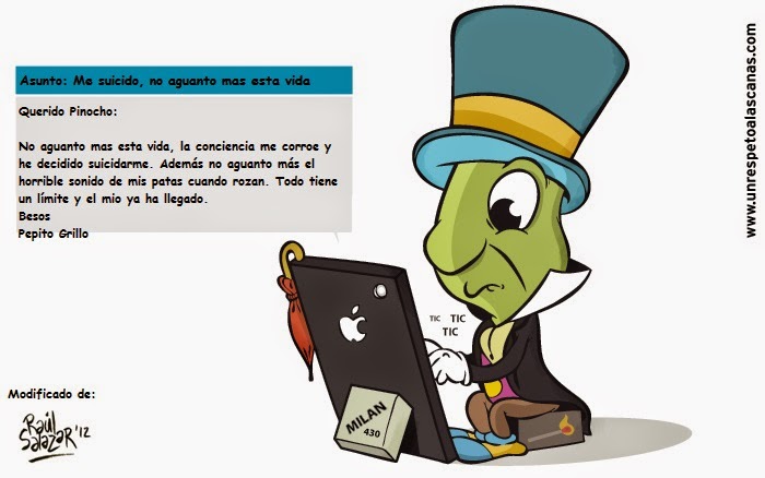 Pepito grillo escribiendo un mail a pinocho para despedirse