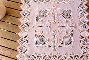 Sobre una lugana blanca, todo va bordado en blanco, salvo unos pequeños toque de color.