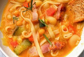 INGREDIENTES:-200 gr de garbanzos-100 gr de pasta variada-1 calabacín-100 gr de calabaza-1 puerro-100 gr de panceta-2 guindillas cayenas-Medio vaso de vino blanco-Romero