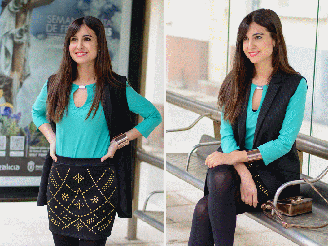 MiniFalda: Forever21/ Zapatos: Gianni / Bolso: Suiteblanco / Camisa: Zara/  Chaleco: Mango / Brazalete: River Island