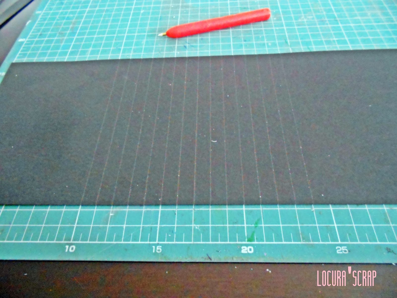 Ahora con la ayuda de una plegadora o un punzón , marcamos a 10cm 11cm 12cm 13cm .... así hasta 24cm , nos sobraran otros 10cm , como se ve en la imagen de abajo ( el tamaño del álbum puede variar según lo queráis , o incluir mas paginas , solo tenéis que dejar los mismos centímetros antes y después de los marcados a centímetros )
