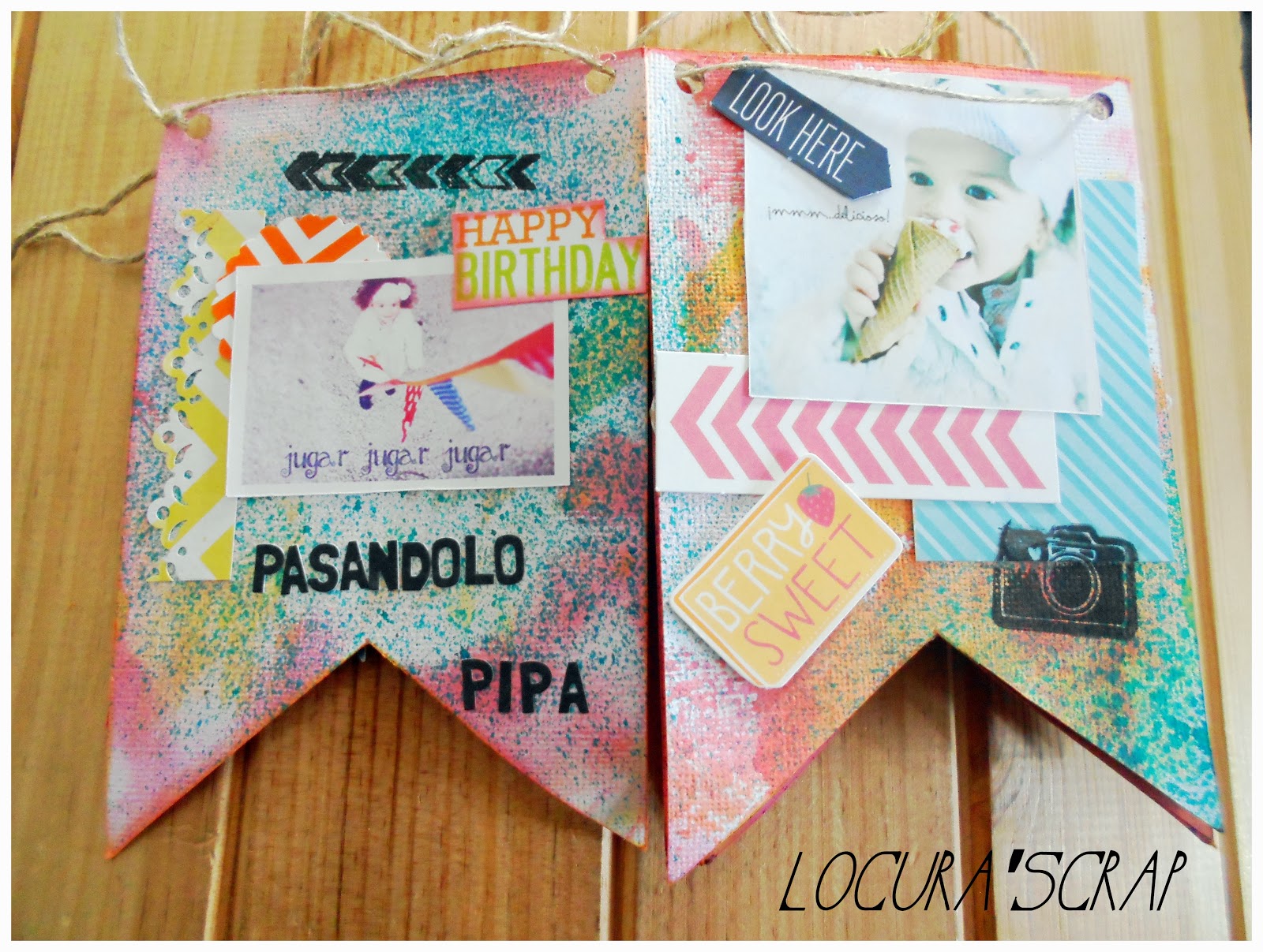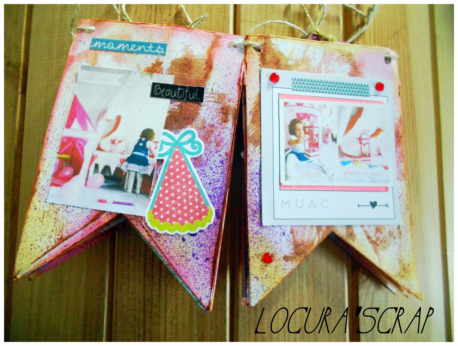 La base del mini álbum son dos papeles básicos blancos,con los que hemos hecho unos banderines , y en los que hemos estado guarreando un poco con las tintas distress ink y dylusions ink spray , para darle color.
