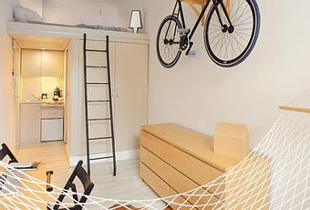 así lo hizo, una cama de matrimonio en un altillo, una bici suspendida como