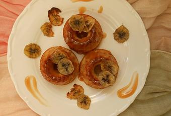 Cortar 1/2 plátano en rodajas y colocar en una fuente de horno engrasada con mantequilla, cocinar a 200º hasta que se doren. Reservar.