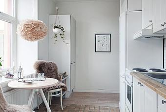 Una sola pieza de mobiliario, iluminación o un accesorio, puede dar ese toque distinto que buscamos a una decoración. El protagonismo de la lámpara de papel y plumas de ganso en la cocina de este mini piso, es clave para ese aire femenino y romántico.