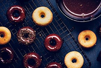 Cobertura de chocolate: pon el chocolate fundido en un plato hondo y ves mojando una cara de cada mini donut. Dejamos que se enfríen. Yo los he cubierto solo por una cara, pero si los quieres totalmente chocolateados, deberás hacer el mismo procedimiento cuando el chocolate de la cara ya bañada se haya enfriado y endurecido.