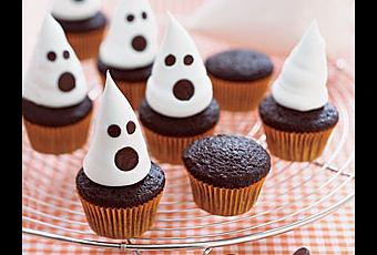 Coloque la crema batida en una manga pastelera con boquilla redonda y forme los espíritus en cada mini cupcakes.