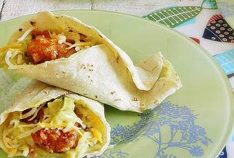 Añadimos en cada tortilla una buena cucharada de guacamole, un solomillo de pollo crujiente y espolvoreamos queso cheddar rallado. Enrollamos las fajitas y listas para comer!