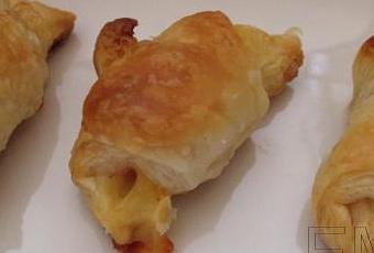 Poner sobre la parte más ancha de cada triángulo de hojaldre una cucharadita de la mezcla de jamón y queso. Enrollar sobre si mismo sin apretar y al llegar al final doblar ligeramente las puntas hacia adentro.