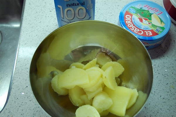 1.- Comenzamos cociendo las patatas. Las podemos cortar en trozos pequeños para que se cuezan antes. Una vez cocidas las colocamos en un bol.