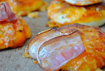 - Cuando tenemos todas nuestras mini-pizzas, vamos montándolas: echamos una cucharadita de tomate y lo extendemos, encima ponemos un poquito de orégano, la mozarella en fideos y 2 trocitos de bacon o pavo.