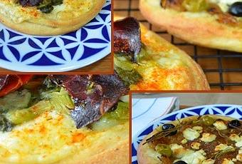 En esta ocasión he preparado varias mini pizzas, aunque sólo pude sacar fotos de estas dos : la de cebolla caramelizada con queso de cabra , romero y aceitunas y la de queso de tetilla con grelos y cecina y espolvoreo de pimentón picante.