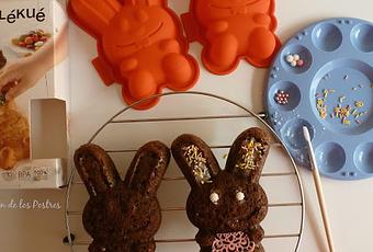 En un vaso ponemos la leche con el limón, dejamos reposar, parecerá cortada, es normal.En el bol ponemos el aceite con el azúcar, la vainilla y la miel, batimos. Le añadimos el huevo, batimos e integramos. Le añadimos la leche con el limón. Le añadimos la harina con el cacao, la sal y mezclamos. En una taza ponemos el bicarbonato y el vinagre, mezclamos, se lo añadimos. Vertemos la masa en los dos moldes de conejo Lékué. Horneamos 25 minutos.Dejamos enfriar sobre una rejilla.Desmoldamos y decoramos a gusto de los niños.