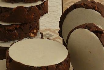 En un molde de silicona con 8 cavidades redondas de 6 cm, ponemos una oblea en el fondo de cada hueco.