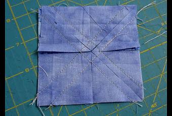 1´5x1´5 , marcamos media pulgado a cada lado de las diagonales y cosemos por allí, cortamos por la diagonal y los centros: