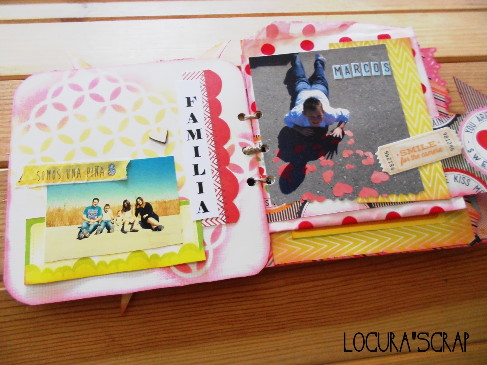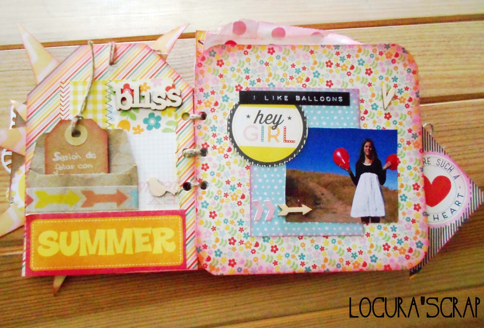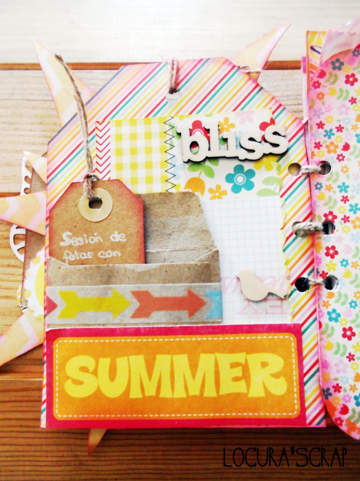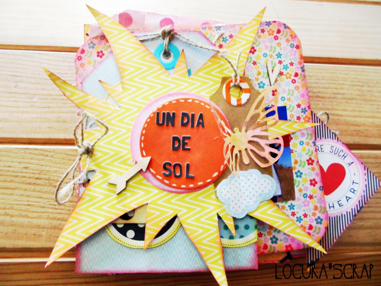 Como ya se va acercando el verano , lo hice , de unas fotitos que teníamos de hace dos veranos , que me encaaaantan , la encuadernación , es un poco inventada ya que le hice una especie de espiral de cuerda , pero que me pareció perfecta y claro la portada no podía ser otra que un super sol , el álbum en si, es deseestructurado , cada pagina es de una manera , para ello he usado la colección de papeles de Hey Kid de Pink Paisleeque me gusta mucho, también use tintas , maderitas , y mil cositas mas .