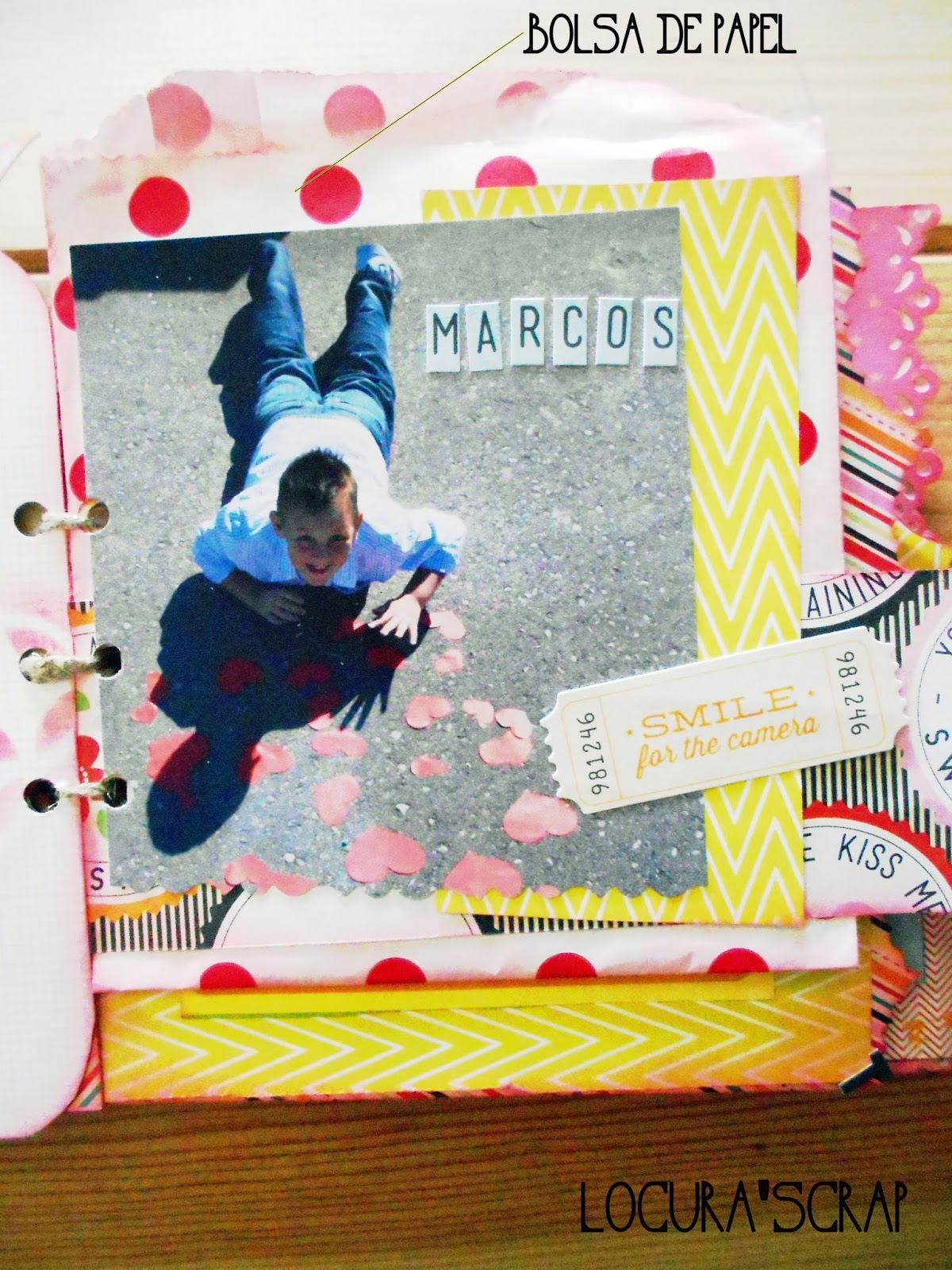 Como podéis veer en las fotos también use plantillas stencil , que es algo que me trae loca , whasi tape no podía faltar , y una de las paginas la hicimos con una bolsa de papel que me parece muy buena idea ya que dentro puedes guardar mas fotos como hecho yo , y ademas queda genial .