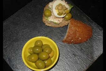 Ingredientes:- 20 aceitunas verdes.- 120 gramos de atún en aceite.- 60 gramos de mayonesa.- 2 huevos cocidos.- Cuatro hojas de lechuga (en la receta original rúcula).- Pan de cereales.