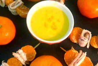 Los enrosco y los ensarto en una brocheta alternando gajos de mandarina. Al comerlos cada uno se añade la salsa que quiere. Le he añadido un pelín de ralladura de mandarina a la salsa
