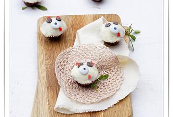 Ingredientes:MiniCupcake:- 100 grms de azúcar.- 150 grms de harina.- 20 gr.ms de cacao en polvo.- 1/2 cucharadita de levadura química.- 1 huevo.- 1/2 cucharadita de extracto de vainilla.- 80 ml de aceite de girasol- 65 ml de leche.- Una pizca de sal.- Papelillos para mini cupcakes.Para la decoración:- Azúcar.- Gotas de chocolate negro.- Lacasitos blancos.- Rotulador negro de tinta comestible.- Sprinkles pequeños redondos rosas.Para la crema de queso:- 30 grms de mantequilla a temperatura ambiente.- 180 grms de queso crema de untar.- 80 grms de azucar glass.