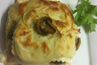 Se cubren las lasañas con la bechamel, se espolvorea con queso rallado y se pone un champi de adorno. Se hornea durante unos 25-30 minutos, hasta que la superficie esté dorada. Se sirve inmediatamente y se disfruta.