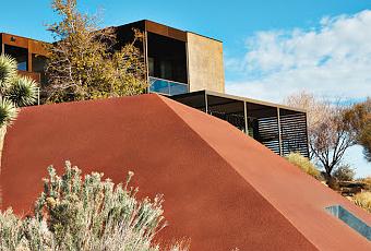 La casa es obra del arq. Marmol Radziner, de Sage Design Studios, y es una propuesta moderna y minimalista en pleno desierto, en un terreno de ondulaciones y arbustos secos.