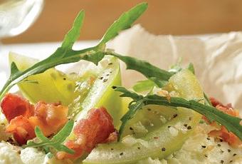 Ingredientes8 piezas de pan árabe1 taza de queso mascarpone2 jitomates verdes cortados en tiras200 g de tocino dorado2 tazas de arúgula2 cucharadas de aceite de oliva150 g de queso brie en rebanadas delgadasPreparación1. Precalienta el horno a 200 oC.2. Divide el queso mascarpone en 8 porciones iguales y úntalas sobre el pan árabe.3. Coloca las rebanadas de queso brie, espolvorea el tocino y hornea todo por 15 minutos.4. Mezcla el jitomate verde con la arúgula, el aceite de oliva y salpimienta. Colócalo sobre las pizzas y ofrece.Visita nuestro blog: http://recetacomidas.blogspot.com.ar