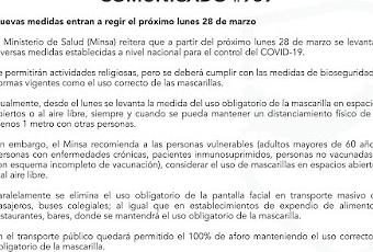 A partir del lunes 28 de marzo del 2022, se levanta la medida sanitaria del uso obligatorio de la mascarilla en espacios abiertos, siempre que pueda mantenerse un distanciamiento físico de al menos 1 metro.
