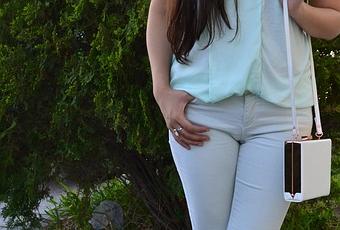 Mint blouse and mint pants; silver shoes and pastel color necklace;