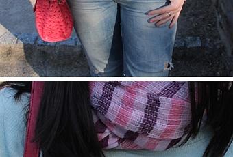Como complementos opté por dar color y aposté por un bolso rosa con piel de avestruz que ya os enseñe en blog de una tienda local, para que hiciera contraste con la sudadera, pues también tiene algún motivo de ese color, bailarinas blancas de Zara de hace varios años y fular rosa de Blanco.