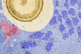 Guardería estelar IC 2944 visto a través del enorme telescopio del OSE', bajo licencia libre CC BY-SA 4.0. Macrofago (azul claro) digiriendo un patógeno fúngico Cryptococcus neoformans. Imagen de Carolina Coelho de Portugal, bajo licencia libre CC BY-SA 4.0.