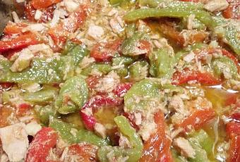 NÚMERO DE PERSONAS4TIEMPO DE PREPARACIÓN60 minutosMATERIAL NECESARIOHorno, bandeja de horno, papel de aluminio, cuchillo, tabla, vaso, fuente para servirINGREDIENTES2 pimientos rojos1 pimiento verde1 berenjena200gr de migas de atún en lataAceite de olivasalPREPARACIÓN1. Vaciamos las pepitas de los pimientos, los salamos un poco y los envolvemos en papel de aluminio.2. Cortamos la berenjena a lonchas longitudinales de aproximadamente un dedo de grosor, las rociamos con aceite y salamos un poco.3. En la bandeja del horno, depositamos las berenjenas y los pimientos y vertemos medio vaso de agua.4. Asamos a 180ºC unos 40 minutos.5. Pelamos los pimientos y cortamos a tiras.6. Cortamos la berenjena a tiras.7. Depositamos las verduras horneadas y cortadas en un recipiente adecuado y aliñamos con aceite y sal.OBSERVACIONESPodemos añadir un poco de ajo picado.