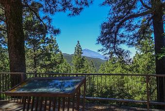 La subida al Parque Nacional del Teide la realizamos tomando la carretera de El Rosario, atravesando el Parque Natural de Las Lagunetas y el Monte de la Esperanza. En el Km 19 hallamos el Mirador de Ortuño, a 1590 metros de altitud, desde el que contemplamos una estampa increíble del colosal Teide y del mar de nubes chocando contra su ladera como si de algodón se tratase.El mirador está rodeado de un bosque autóctono de pino canario. En los días claros se puede divisar la costa noroeste de la isla y hasta la isla de La Palma.