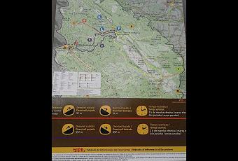 Volvemos sobre nuestros pasos hasta el cruce, donde en esta ocasión seguimos la ruta morada. A través de camino cada vez con terreno más irregular, y siguiendo un cortafuegos, llegamos a un punto donde dos grandes paneles nos informan sobre la geología de los cuchillos a modo introductorio de lo que vamos a ver.