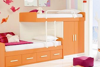 Miren en esta foto hay 2 camas, una arriba y otra abajo el armazón es de color naranja además las lunas de la habitación hace que se vea aún mucho mejor, pero también hay un lado en el que puedes guardar la ropa de tu hija, son ideas originales con un diseño de muebles para dormitorio de niña.