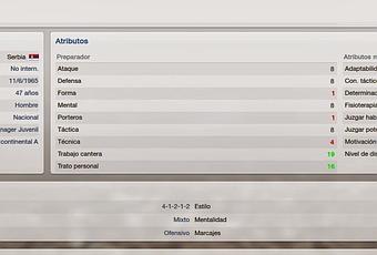 Miroslav Nikolic es un hombre de nacionalidad serbia, que nunca ha sido internacional. Nacido el 11 de junio de 1965 por lo tanto ahora tiene 47 años. Su reputación es nacional y el club ejerce de Mánager juvenil, tiene la Licencia Continental A.Los únicos atributos a destacar son el Trabajo cantera con 19 y el Trato personal con 16. Su formación preferida es 4-1-2-1-2 con presión mixta y preparación ofensiva. Un estilo directo, de mentalidad muy cauta y una combinación de marcajes.