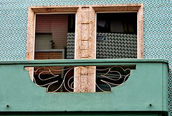 7. Balcón a la modaLos maniquís salen al balcón. Fachada pintada en color granate simulando piedra y con decoración superior de formas vegetales y balcones de forja.