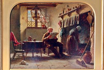 ◊ «Domestic Peace» (La paz del hogar), de Sydney Sprague Morrish, un óleo sobre tabla de ca. 1810. Esta íntima escena doméstica es una típica pintura de género, un estilo muy popular durante la época victoriana en el que se representan escenas cotidianas en interiores o exteriores. En ella Morrish incluyó diversos objetos rojos que, empezando por el trapo colgado del respaldo de la silla, pasean la mirada del observador por todo el cuadro formando una especie de círculo que se cierra con la firma del artista, también en rojo.