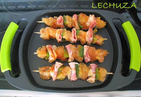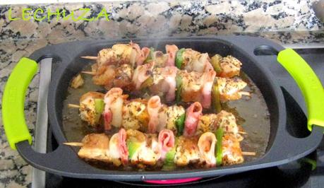 Tiene 2 capas de superficie antiaherente, lo que permite cocinar sin apenas grasas, lo que se traduce en una comida doblemente sana. Aquí tenéis un ejemplo de pinchitos de pollo y bacon, cuya receta podréis encontrar en el enlace.