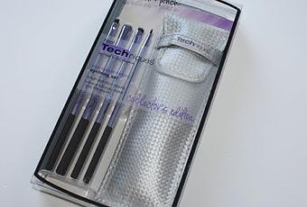Este set consta de cuatro pinceles de acabado metalizado, cada uno de ellos diseñado para un fin o forma de delinear, ojos mas marcados, mas acentuados, difuminados, lineas gruesas, finas, etc; y un neceser para guardarlos, protegerlos y transportarlos. Confieso que el neceser me volvió loca nada mas verlo y fue una de las causas de que cayera con este set.