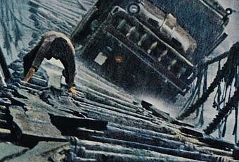 Pero quitando lo que he puesto más arriba, el cartel en sí es impactante y directo. No se basa en el típico, aunque en versiones posteriores se ha hecho y de mala manera, póster donde la cabeza del/ los intérpretes acapara todo el protagonismo, si no que aquí se opta precisamente por el suspense de tener una furgoneta -equipada para los obstáculos a los que tienen que enfrentarse- en medio de un puente de madera nada -salta a la vista- seguro. Si a eso sumamos la posición en la que se encuentra dicho vehículo (que me caigo, que no me caigo) y un hombre intentando ¿arreglar? el desaguisado que tienen entre manos, nos encontramos con un cartel de los que se quedan en la retina durante muchos años. Algo que me ha pasado a mí, como es evidente.