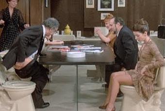Comer a escondidas y defecar en público y en compañía. Inversión de términos, subversión de conceptos. Cada cosa es lo que es y su contrario. Puro surrealismo tan tarde como a mediados de los años setenta del pasado siglo, quizá haya sido Luis Buñuel el surrealista más consecuente, coherente y tenaz en sus postulados de entre todos los miembros de aquella escuela. Tan divertida como reveladora, tan contestataria e inconformista como lúcida, puro retrato de nuestra realidad decadente.