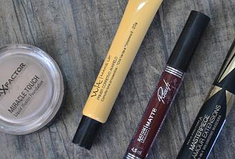 Labial Ricosti color WineMascara de pestañas Max FactorBase miracle touch Max Factor ( Reseña ACA)Corrector amarillo VULTLapiz Negro Colossal Maybelline ( Reseña ACA)Delineador Maybelline Master GraphicPincel Duo Fibre de Lidherma Mimika.