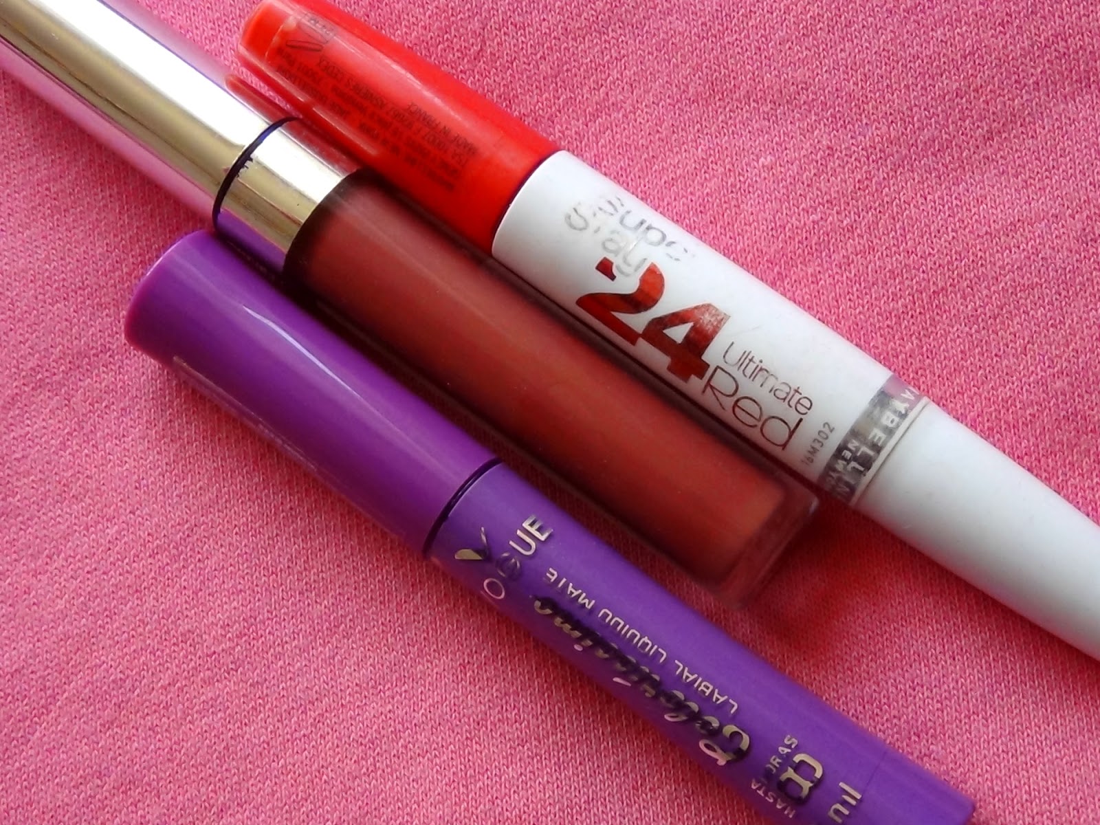 Coloríssimo de VogueSu tono es el Malteada y es un labial líquido de acabado matte. Es larga duración, huele muy rico, no reseca los labios y en versus precio/calidad va genial. Sale 4mil pesos Chilenos apróx.Super Stay 24 hrs. de MaybellineEl tono es el Tangerine pop, labial de larga duración con tonalidades naranjitas. Tiene dos aplicadors, primero el color y luego el hidratante tranparente. Hace poquito cambio su presentación, pero es el mismo. Sale no más de 5mil pesos Chilenos.Colourpop Ultra MatteSu tono es el Frick n Frak y tiene tonos terracota rosaditos. Es un labial de larga duración supuestamente, pero no me aguanta ni la comida ni los besitos. Hay que retocar. No seca los labios y sale apróx. 9mil pesos Chilenos.