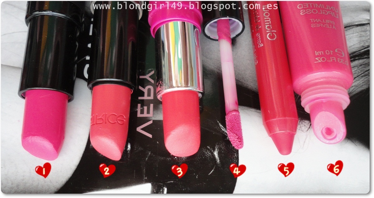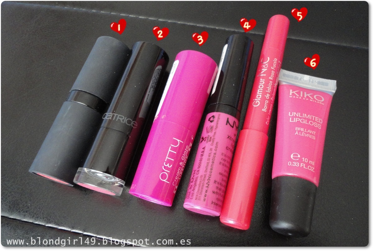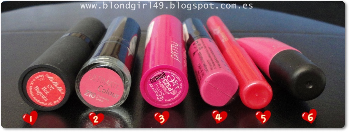1. Barra de labios Hot Magenta nº07 de Mememe2. Barra nº210 Pinkadilly Circus de Catrice3. Barra de labios nº323 de Flormar (clon del Impassioned de MAC)4. Lip cream nº01 Dolly Girl de NYX5. Barra de labios (formato jumbo) Rosa fucsia de Deliplus6. Unilimited Lipgloss nº24 de Kiko