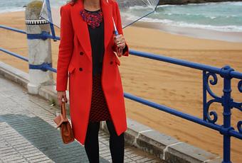 Esta vez lo combiné con camisa fluida azul marino y falda lápiz de punto en azul y rojo. Como veis dando color a un día de lluvia.