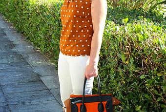Y ahora voy con el lo que he elegido para enseñaros mi nuevo bolso. Una combinación sencilla jugando con los tonos marones y naranjas del bolso en el top y los zapatos y añadiéndole luminosidad con el blanco de los pantalones.
