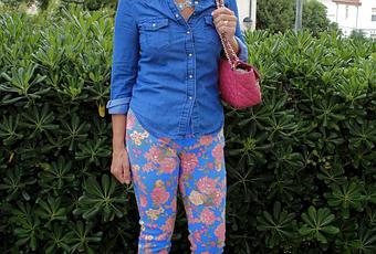 Para lucir estos jeans de estampado floral he elegido una camisa vaquera y bolso y sandalias en rosa fucsia. Espero que os guste pero ya sabéis admite más combinaciones.